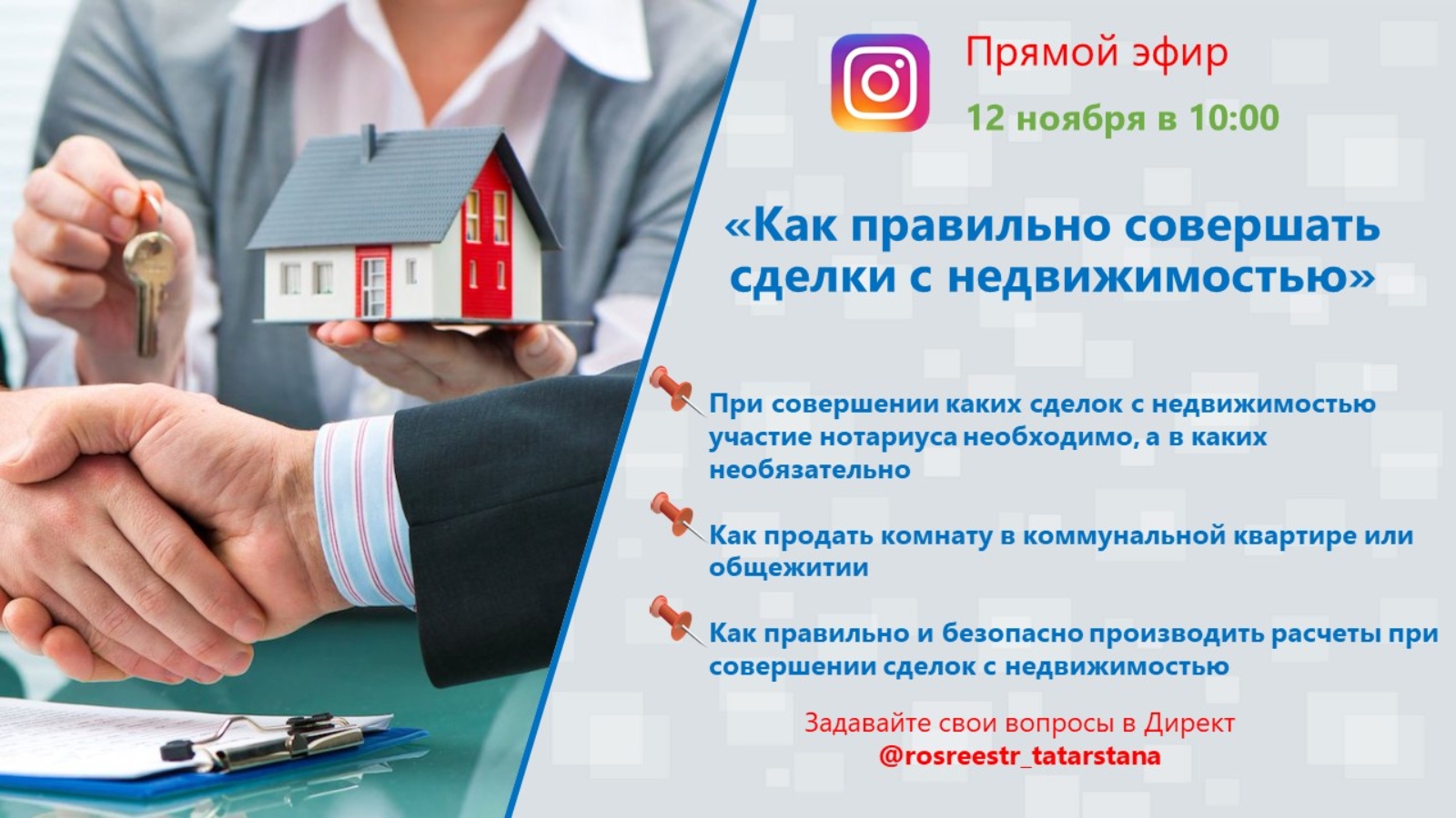 12 ноября в 10.00 Управление Росреестра по Республике Татарстан проведёт в Инстаграм прямой эфир по вопросам совершения сделок с недвижимостью.