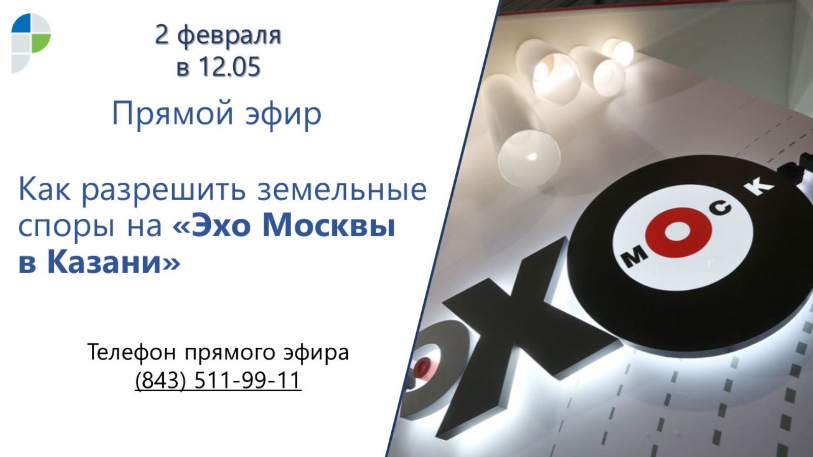 2 февраля в 12.05 на радио «Эхо Москвы в Казани» состоится прямой эфир по вопросам нарушения земельного законодательства.
