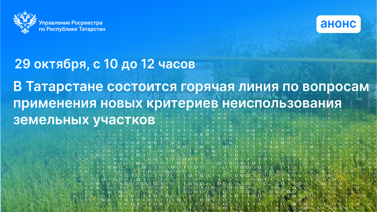Завтра, 29 октября, Управление Росреестра по Республике Татарстан проведет очередную телефонную горячую линию для владельцев земельных участков в связи с действием с 1 сентября 2025 года Постановления Правительства РФ, которое определяет признаки неиспользования земельных участков, относящихся к землям населенных пунктов, садовых и огородных участков.