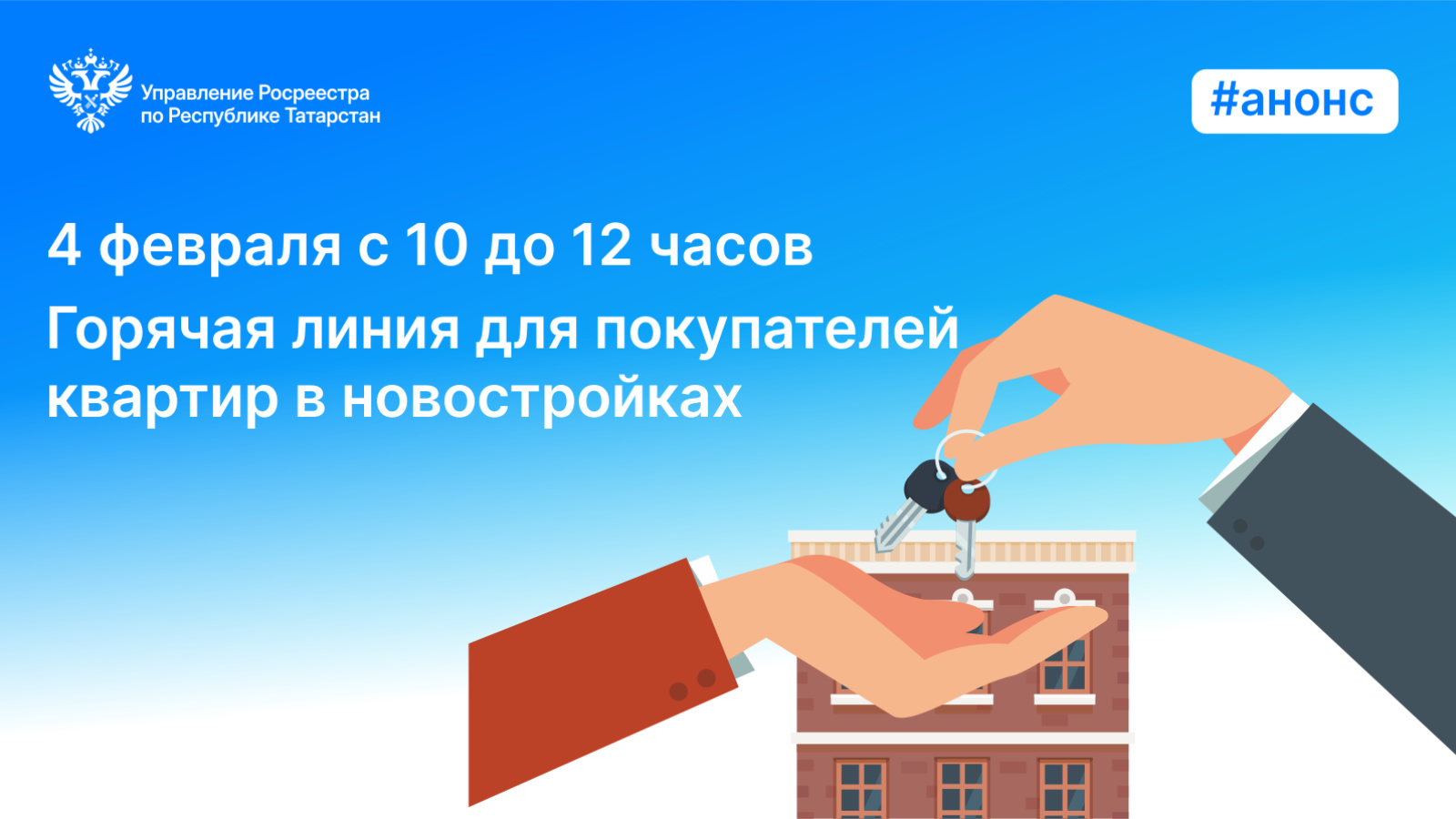 Завтра, 4 февраля, в связи с увеличением спроса на первичную недвижимость, Росреестр Татарстана проводит горячую телефонную линию для покупателей квартир в новостройках – участников долевого строительства.